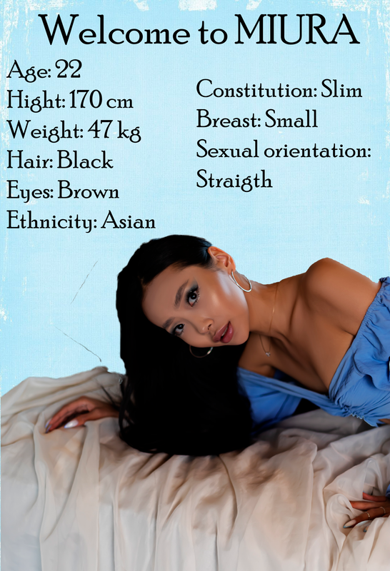 Miura, 22 años. No solo soy modelo aquí, soy modelo fotográfico y modelo de pasarela en la vida real. Mido 170 cm de altura. Peso – 47 kg. Tetas: pequeñas y turgentes. Corte de pelo íntimo: totalmente afeitado.